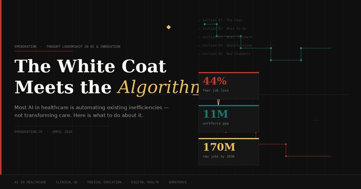 OpenOvation · Thought Leadership in AI & Innovation The White Coat Meetsthe Algorithm. Most AI in healthcare right now is automating existing workflows — not transforming care. Understanding that