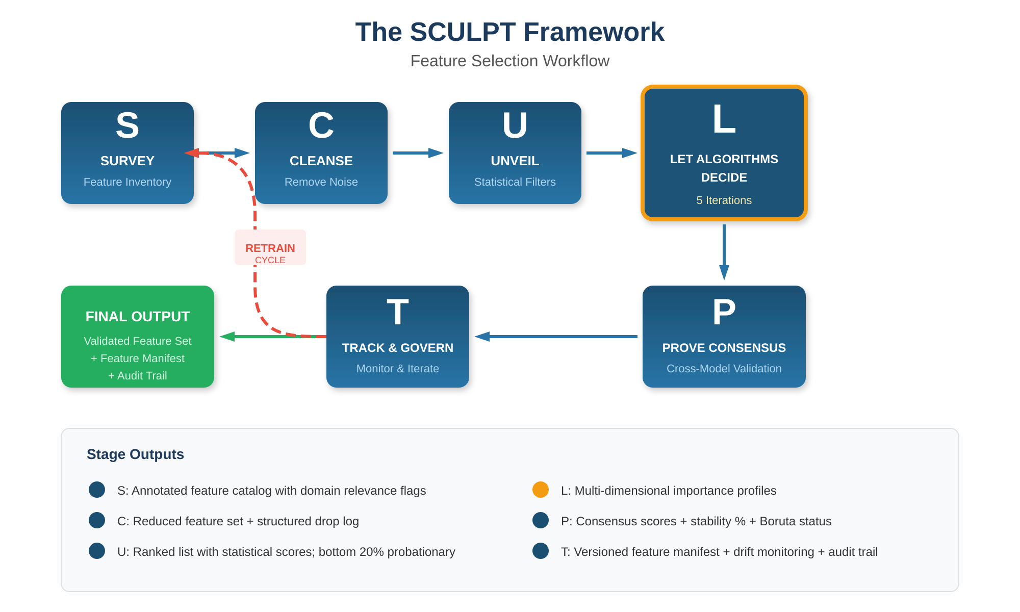 This article introduces SCULPT—a six-stage framework (Survey, Cleanse, Unveil, Let algorithms decide, Prove consensus, Track and govern) that provides a structured decision workflow for feature selection and dropping across the full model development lifecycle. SCULPT is distinguished by three characteristics: it treats feature selection as a progressive, iterative process rather than a one-time step; it explicitly leverages the inherent feature selection mechanisms built into ML algorithms during training; and it embeds governance and auditability as first-class requirements rather than afterthoughts.