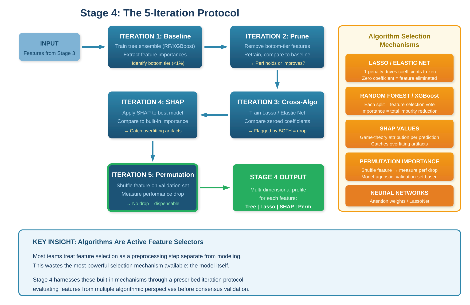 Algorithms as active participants. Treating feature selection as a pre-processing step that precedes modeling wastes the most powerful selection mechanism available: the model itself. Lasso zeros coefficients. Trees vote at every split. Gradient boosting concentrates on residual-reducing features. Stage 4 deliberately harnesses these built-in mechanisms through a prescribed iteration protocol.